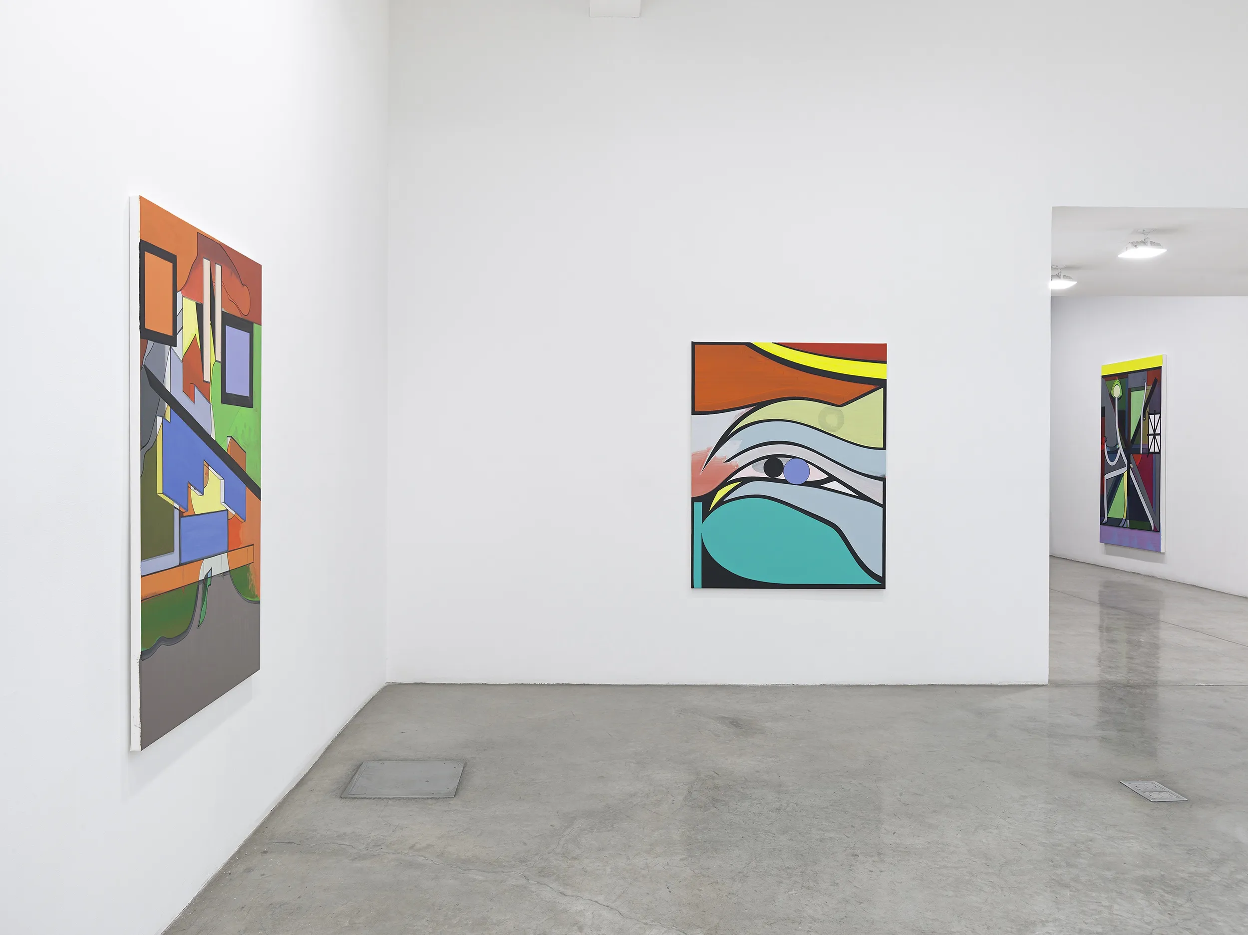 The accumulation of recognizable motifs from the artists’s visual lexicon - substitutes of droplets, eyes, vaguely familiar animal forms, and minimally rendered figures - appear throughout Virus 5, Fama and Speicher 1072. Gestural markings are held in a delicate balance by rigorously rendered geometric forms and compositions. Once again, Scheibitz shows his mastery of colors, from steely grey to lurid turquoise, strokes of powdery blues and peach hues contrast the harsh and subtle forms. Consistent with Scheibitz's work over recent years, one can see the layers of paint that have been applied and intuitively painted over in search of the perfect composition. While the final subject matter might appear to be rendered as a flat surface, the complexity and depth created by the interaction of the geometric and abstract forms exhibit an intriguing dimensionality.