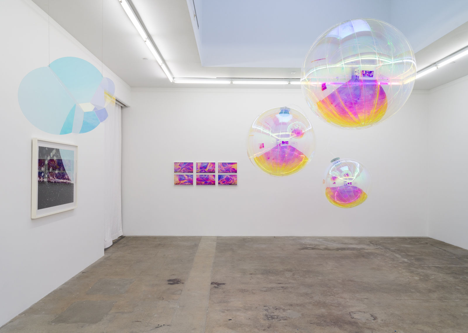 In the main space, a new body of work invites visitors to attune with bodies and forces on air. Encountered through a re-coding of color and temperature, Saraceno’s cloud and foam sculptures propose complex geometric systems of fractal color through which light illuminates in myriad constellations. From the nacreous glow of spider/webs, to the energetic heat evidenced by a star’s celestial color, the artist has long sought to make visible the spectral hues and synesthetic vectors that shape the cosmic web. A series of infrared photography suggests an era beyond the use of aerodynamics; here, temperature measurements rendered in colors reveal the thermodynamic vitality in the bodies of “lighter than air” aerosolar flight. In suspended sculptures, the allure of iridescence—the phenomena of luminous color produced by a particular intersection of light and viewing angle—becomes an allegory for a rapidly warming planet.