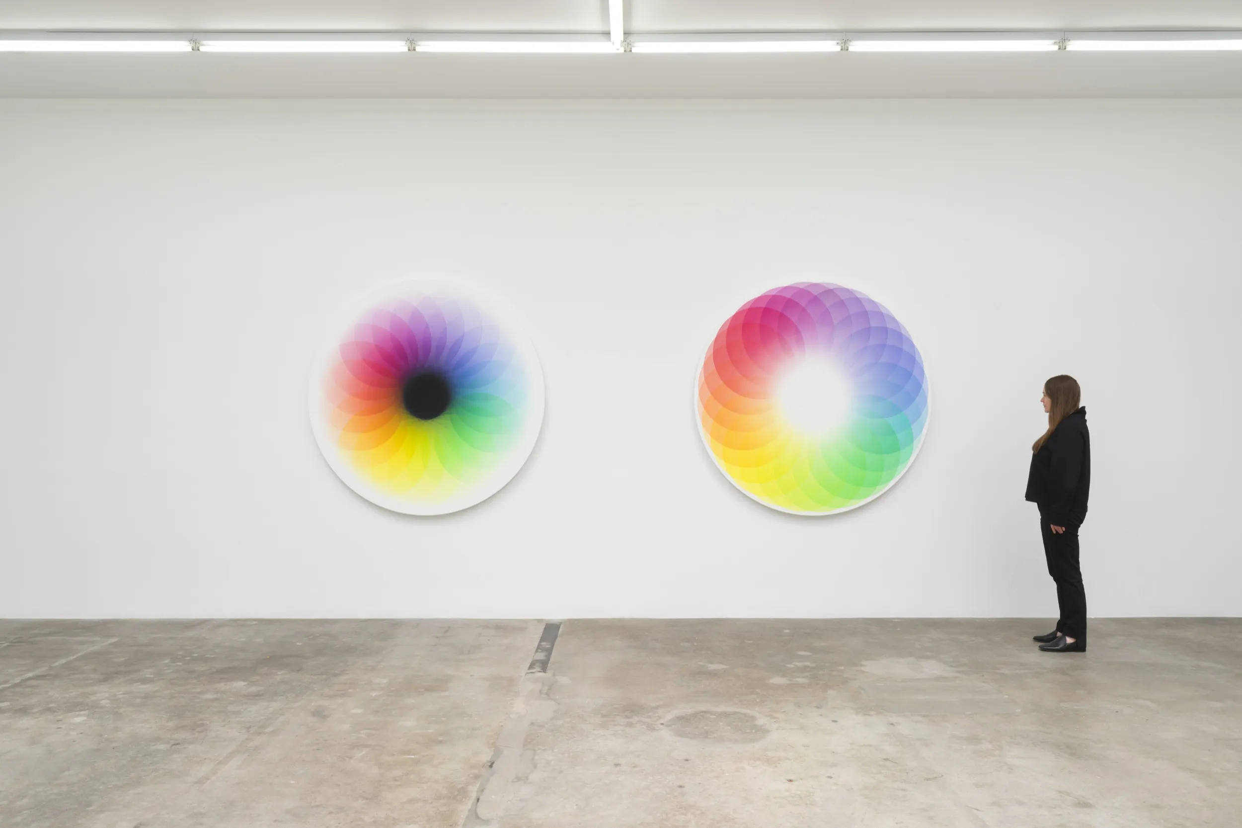 • Installation view of two Olafur Eliasson circular paintings with a person